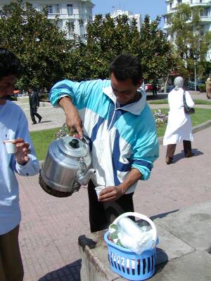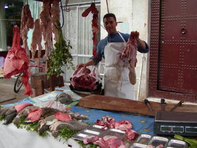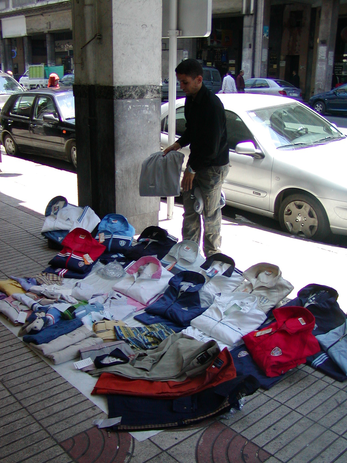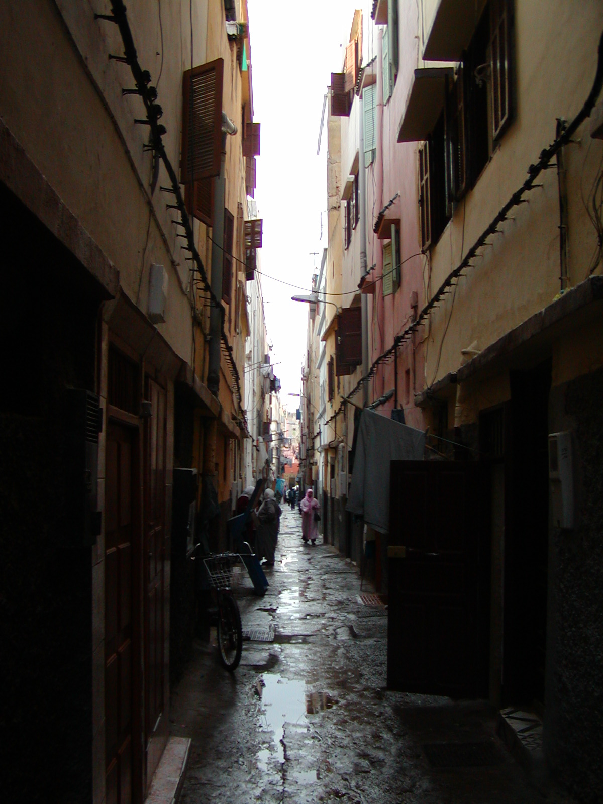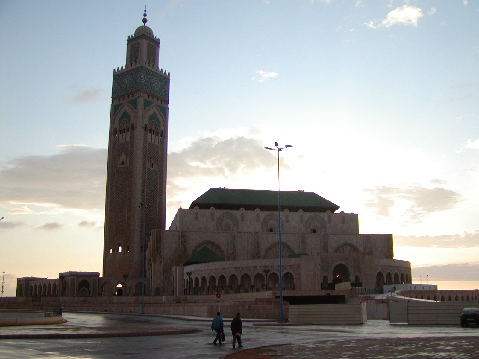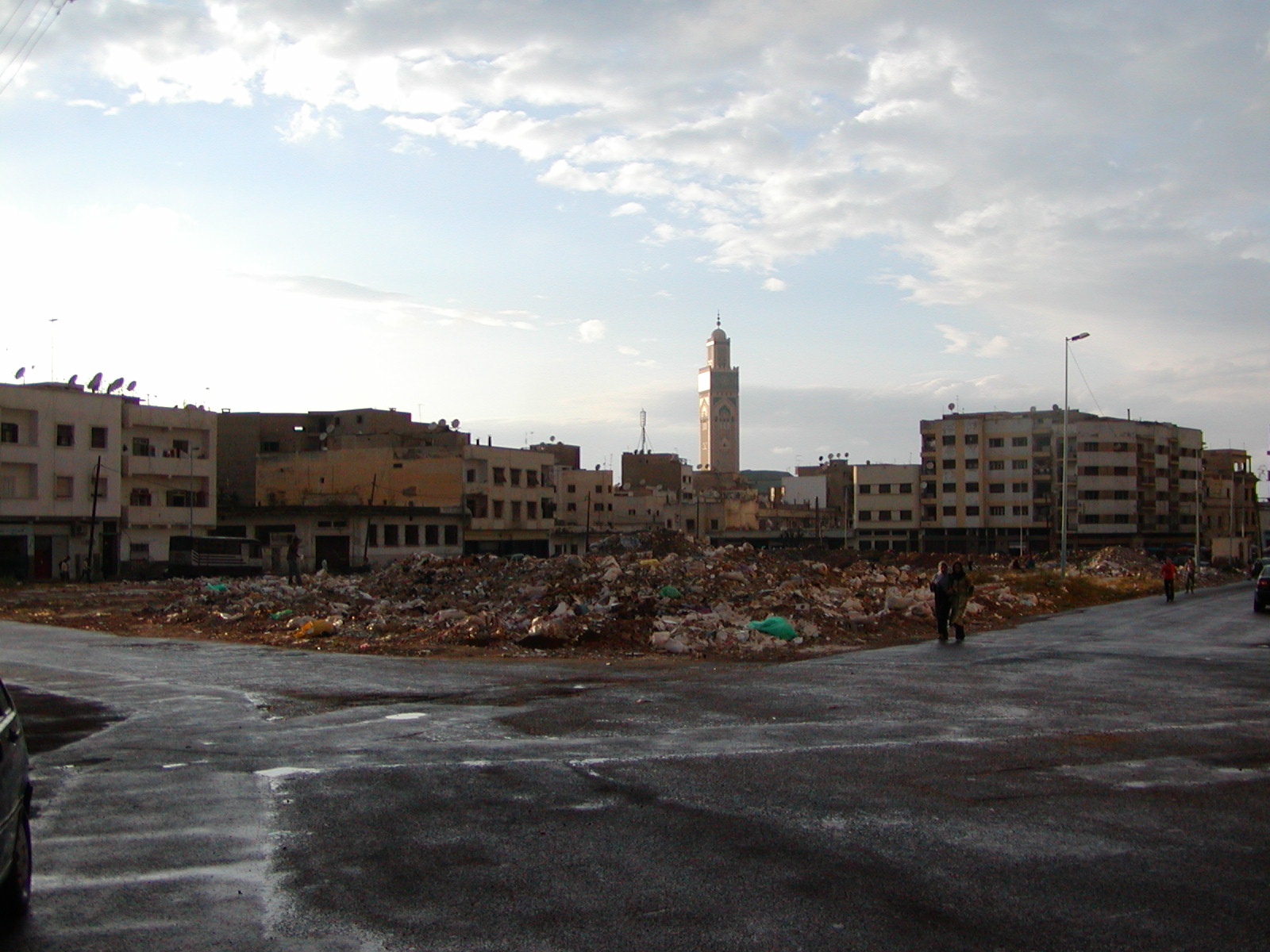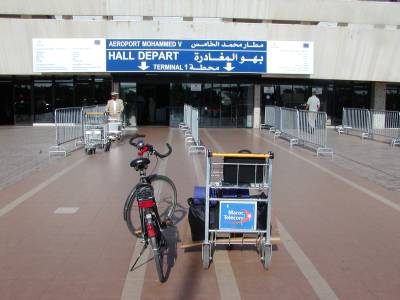 In Casablanca habe ich nun noch zwei volle Tage Zeit, um die Stadt ein wenig kennen zu lernen. Lieber möchte ich sofort nach Hause, aber das geht nicht. Mein Flugticket ist erst am Freitag gültig. Sightseeing wie in anderen Großstädten gibt es hier nicht, zumindest habe ich nichts derartiges gefunden. Also mache ich mich - natürlich immer zu Fuß - auf den Weg, kaufe ein wenig Nahrungsmittel ein, besichtige die "Ancienne Medina" (Altstadt) und besuche verschiedene Restaurants sowie zweimal den Internetladen. Eine gute Hilfe dabei ist der Stadtplan von Casablanca, den ich in einem Buchladen für stolze 4,50 Euro erworben habe. Trotzdem finde ich nicht alles, weil mal wieder die Wirklichkeit nicht immer mit dem Plan übereinstimmt. Aber insgesamt hilft er mir vor allem, immer wieder zum Hotel zurück zu finden. Am Dienstag abend will ich "Rick's Cafe", ein Cafe, das dem im berühmten Film "Casablanca" mit Humphrey Bogart und Ingrid Bergmann (Handlung im 2. Weltkrieg) nachempfunden ist, besuchen. Trotz Plan verlaufe ich mich erheblich und gelange immer tiefer in Bezirke, wo die ärmste Stadtbevölkerung wohnt, kauft und verkauft. Es ist abenteuerlich und noch dreckiger als in den anderen Teilen der Stadt. Die Adresse von "Rick's Cafe" ist Bl. Sour Jdid 284, das weiß ich aus dem Internet. Irgendwann bei Sonnenuntergang komme ich tatsächlich am Bl. Sour Jdid an, d.h., ein Straßenschild ist nirgends zu finden, aber nach dem Plan gibt es keine andere Möglichkeit. Ich wandere den "Boulevard" nach Nordwesten weiter mit steigenden Hausnummern. Am Ende befindet sich die riesige Moschee Hassan II, angeblich die zweitgrößte der Welt nach Mekka. Das mag sein, es ist ein gigantischer Komplex, aber völlig menschenleer und umgeben von Müllkippen und Slumgebieten. Ich habe keine Lust, näher zu kommen. Am Ende der Straße ist die höchste Hausnummer weit unter 200. Also kehre ich um und wandere bis zum anderen Ende, ca. 2 km. Hier sind vorsichtshalber gar keine Hausnummern mehr, dafür aber riesige militärische und streng bewachte Gebäude. Ich mache, dass ich weiter komme. Am Ende der Straße steht so eine Art gezeichneter Stadtplan für Touristen, auf der einen Seite ist das Glas und die vermutlich dahinter zunächst vorhandene Karte zerstört, auf der anderen Seite findet sich eine Aufzählung der Sehenswürdigkeiten, unter anderem auch "Rick's Cafe". Nur wo? Ich frage einen Passanten, der mit den Schultern zuckt, dann mit dem Finger auf der arabischen Schrift Buchstabe um Buchstabe den Artikel über das Cafe liest und nach 10 Minuten doch nicht sagen kann, wo es sich befindet. Ich will gehen und schaue enttäuscht noch einmal in die Runde. Dabei stelle ich fest, dass ich mich direkt vor "Rick's Cafe" befinde! Ich schieße ein paar Fotos, die der draußen sitzende Türposten erst gestatten will, als ich ihm erkläre, auch gleich hineinzugehen. Drinnen spielt ein Farbiger aus USA auf dem Flügel Filmmusik der 40er und 50 er Jahre, also aus der Zeit des Films, und singt dazu. Die Bedienung ist sehr freundlich, die Preise erträglich und die Stimmung angenehm. Ich kann mich richtig entspannen. Hinterher komme ich mit einem Ehepaar aus Deutschland ins Gespräch, die mit Zelt und Van zur Zeit in Marokko Urlaub machen. Der Weg zurück zum Hotel ist viel kürzer als der Hinweg; nach 20 min bin ich da. Am Donnerstag gehe ich noch einmal in die Altstadt, um eine große Tasche zu kaufen. Ich darf laut Flugticket nur zwei Gepäckstücke mitnehmen, das eine ist das Fahrrad, und alle anderen Gepäckstücke muss ich in eine große Tasche packen. Das ist kein Problem, ich bekomme nach einigem Handeln für 10 Euro eine große Tasche, in die alles hineinpasst. Am Nachmittag suche ich den Park der Arabischen Liga auf, um mich ein wenig ins Grüne zu setzen. Aber irgendwie ist der Park doch nicht so gut gepflegt; nach kurzer Zeit kehre ich wieder um. Ein letztes Mal esse ich in einem marokkanischen Restaurant zu Abend, wo das Essen zwar billig, aber auch schon kalt ist. Meine Hotelrechnung von insgesamt 36 Euro für drei Tage sowie die Taxikosten für den Transport zum Flughafen (20 Euro) bezahle ich jetzt schon. Mit wird zugesichert, dass das Taxi um 7 Uhr da sein wird und das Fahrrad transportieren kann. Außerdem wolle man mich um 6:30 wecken. Ich bin schon um 6 Uhr auf. Kein Mensch versucht, mich eine halbe Stunde später zu wecken. Um 7 bin ich mit dem Gepäck und dem Fahrrad unten, der Nachtportier schläft auf einer Decke vor der Rezeption. Vor der Tür steht ein Mercedes Baujahr 1975 (wie fast jedes zweite Auto in Marokko ein Mercedes der 70er oder 80er Jahre ist). Das Fahrrad wird einfach mit dem Hinterteil in den Kofferraum gepackt, das Vorderrad hängt heraus, der Kofferraumdeckel wird mit einem Gummizug geschlossen, soweit es geht. Ich weise noch einmal darauf hin, dass ich die Fahrt bereits bezahlt habe, worauf es eine erregte Diskussion des Taxifahrers mit dem Nachtportier gibt, die etwa 5 Minuten andauert. Letzten Endes fährt der Taxifahrer los. Gurte sind zwar vorhanden, lassen sich aber nicht anlegen. Ich habe keine Ahnung, wie weit der Flughafen von Casablanca entfernt ist, vermute aber etwa 17 km, weil in der Beschreibung des Campingplatzes von Casablanca stand, dass er 17 km von der Innenstadt entfernt sei und in der Nähe des Flughafens liege. Der Taxifahrer fährt und fährt. Einmal kommen wir an einer Müllkippe vorbei, die mindestens drei km lang ist und die ganzflächig brennt! Den Gestank kann man sich kaum vorstellen. Ich bekomme im Taxi fast keine Luft mehr. Den Fahrer stört es scheinbar nicht. Das ist wohl die marokkanische Art der Müllentsorgung. Endlich kommen die ersten Hinweisschilder zum Flughafen. Als wir ankommen, meine ich, dass wir etwa 60 km gefahren sind. Das hätte ich mit dem Fahrrad nicht mehr rechtzeitig geschafft. Gut, dass ich mir ein Taxi genommen habe! Am Iberiaschalter zwingt man mich beim Einchecken, das Fahrrad von einem der "professionellen" Einpacker v