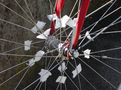 Heute scheint wieder die Sonne vom strahlend blauen Himmel, aber es ist kalt, so etwa 8 Grad. Das ändert sich im Laufe des Tages, aber wärmer als 20 Grad wird es nicht mehr. Ich muss das Zelt noch feucht vom Tau einpacken. Heute geht es über das Jura-Gebirge, und ich weiß nicht, wieviel Zeit ich dafür brauche. Der nächste Campingplatz ist aber erst in Solothurn, und ich will nicht wieder so spät ankommen. Am Campingplatz gibt es kein Frühstück. Ich habe aber den Eindruck, dass ich eins brauche, und so finde ich nach 7 km in Bad Bellingen ein Hotel, wo ich ordentlich frühstücke. Heute am ersten Mai ist halb Deutschland zu Fuß und auf Rädern unterwegs. Auf den Radwegen gibt es richtig Gedrängel. Aber alle sind fröhlich und grüßen gerne. An einer Stelle spielt sogar eine Jazz-Band. Ich stelle hier ein Video (mit Ton) ins Netz. (Man muss Quicktime installiert haben) Ich möchte gerne in Basel in ein Internetcafe. Ich muss endlich meine eMails abrufen, das kann bzw. will ich mit dem Handy nicht, weil ich dann für das Herunterladen der Hunderte an Spams viel Geld bezahlen müsste. Also: wer mir schreiben möchte, sollte bitte das Kontakt-Formular hier auf der Casablanca-Seite benutzen. Den Fehler habe ich behoben. EMail geht nur selten, vielleicht gar nicht. Aber meine Hoffnung, dass heute in der Schweiz kein Feiertag ist, erfüllt sich nicht. Hier ist auch alles geschlossen, bis auf die Cafes und Restaurants. Internet gibt's heute nicht. Ich habe seit gestern zunehmend Schwierigkeiten mit dem Sehnenansatz der Oberschenkelmuskeln am rechten Knie. Jeder Pedaltritt schmerzt. Ich kenne das schon von der Nordkap-Tour. Da habe ich etwas mehr mit dem anderen Bein getreten, und nach 2 Tagen ging es wieder. Allerdings muss ich heute einen Pass fahren, da kann ich das rechte Bein nicht so sehr schonen. Ich mache viele Pausen und fahre nicht so schnell. Und siehe da: Die Schmerzen lassen nach, ich kann von Liestal an ständig bergauf fahren, nahezu ohne Schmerzen. Wahrscheinlich ist es jetzt überstanden. Oben am Pass ist es wesentlich kühler als unten. Beim Herunterfahren ziehe ich die Jacke an. Leider hat dieses dämliche Knacken am Vorderrad (wie auf der Nordkap-Tour) wieder angefangen und wird immer lauter. Es ist so laut, dass die Leute sich schon umdrehen. Um auszuschließen, dass es die Speichen sind, die an einander reiben und diesen Lärm machen, klemme ich kleine Stückchen eines Tempo-Tuchs dazwischen (siehe Bild). Das Knacken bleibt, wird dadurch gar nicht beeinflusst. Also ist das Lager des Vorderrads wohl wieder kaputt. Ich muss morgen sehen, dass ich einen Fahrradladen finde. Hier in der Schweiz dürfte das nicht schwierig sein. Heute habe ich nur etwas mehr als 100 km geschafft, aber insgesamt schon ein Fünftel der gesamten Strecke. Wenn es so weitergeht, werde ich pünktlich am Ziel sein. Der Campingplatz in Solothurn ist gut. Ich genehmige mir im Restaurant noch einmal ein Schnitzel. Ursprünglich wollte ich Spaghetti bolognese, aber das haben sie hier nicht. Heute nacht werde ich sicher wieder gut schlafen. Mal sehen, wie weit ich morgen in Richtung Genf komme. |