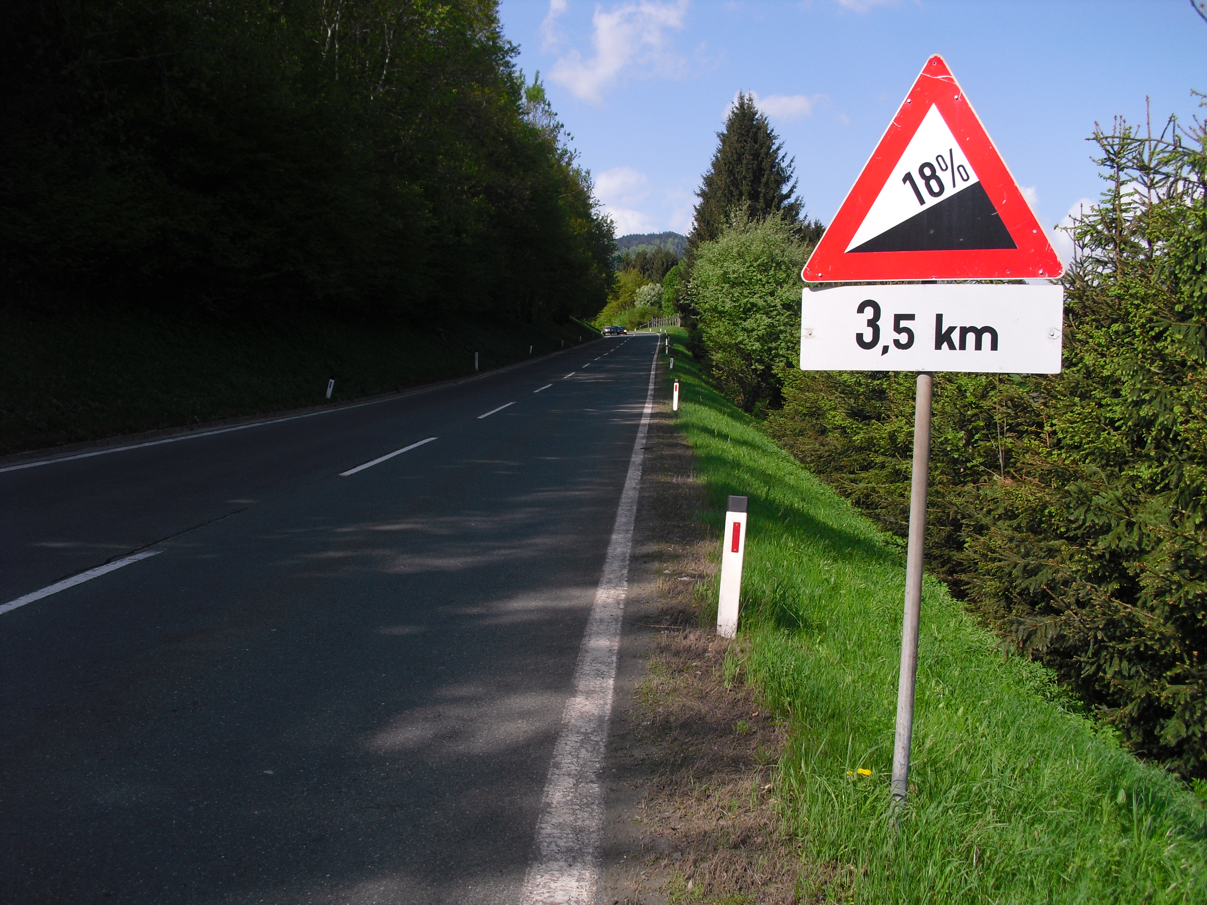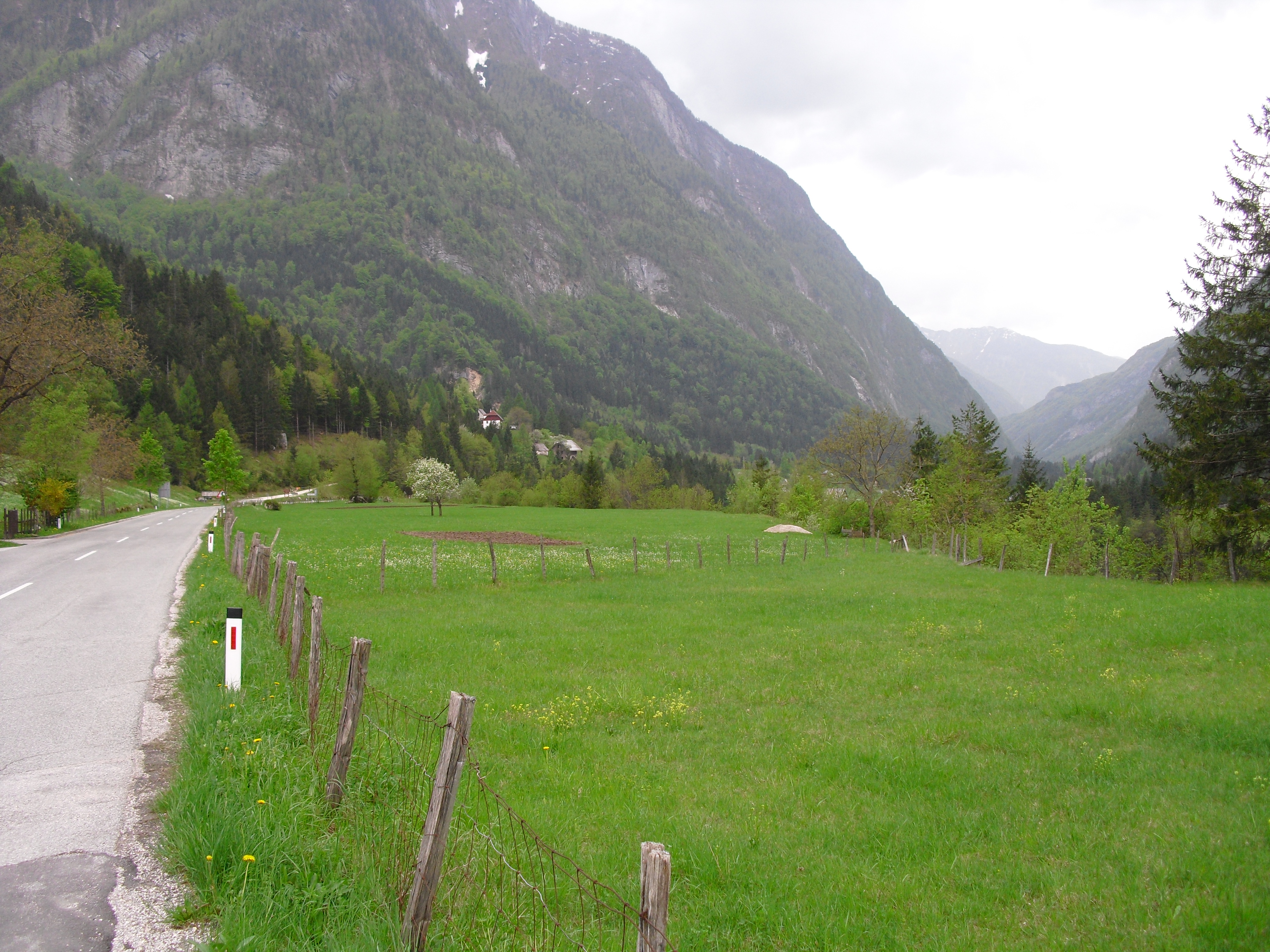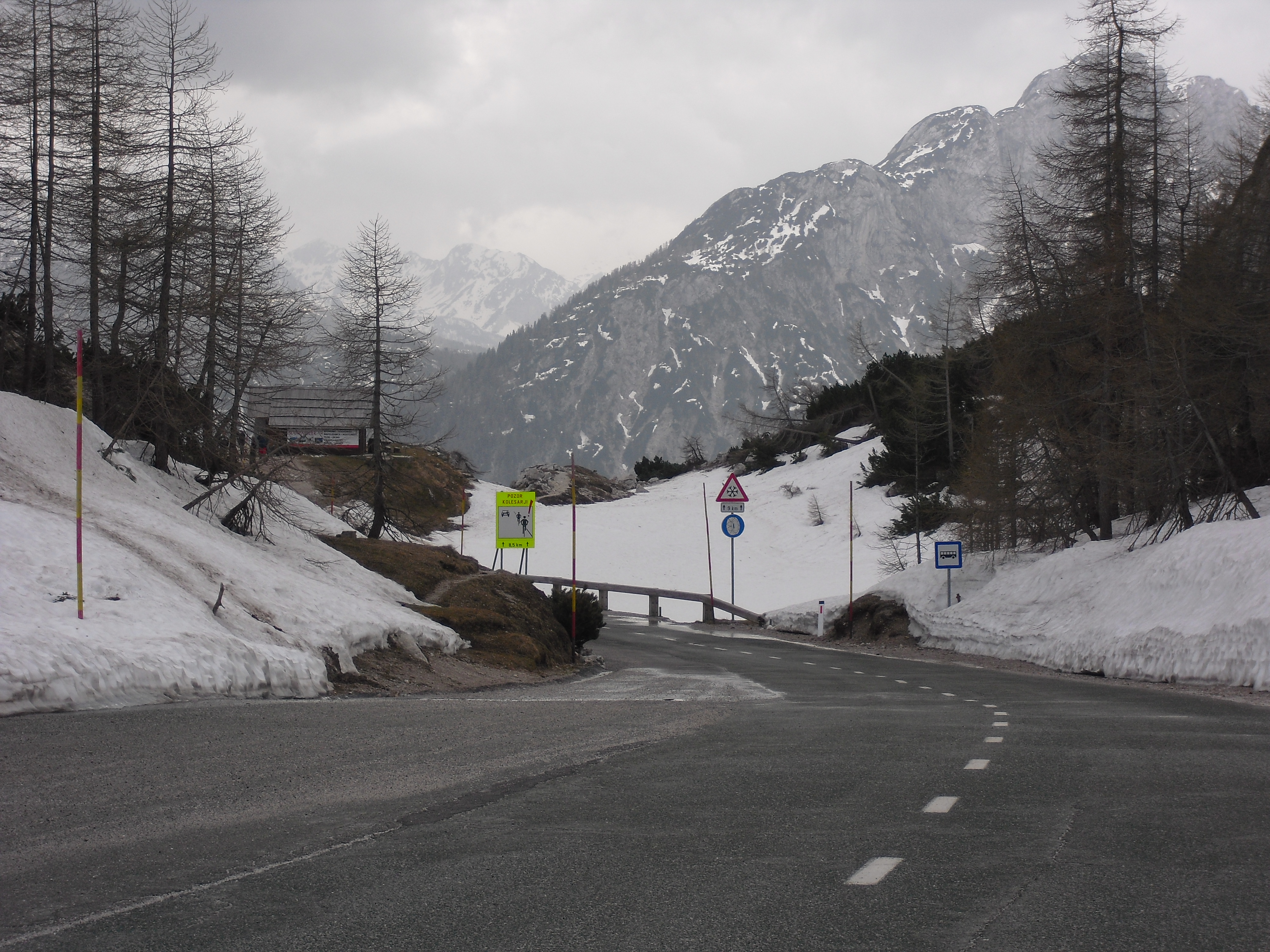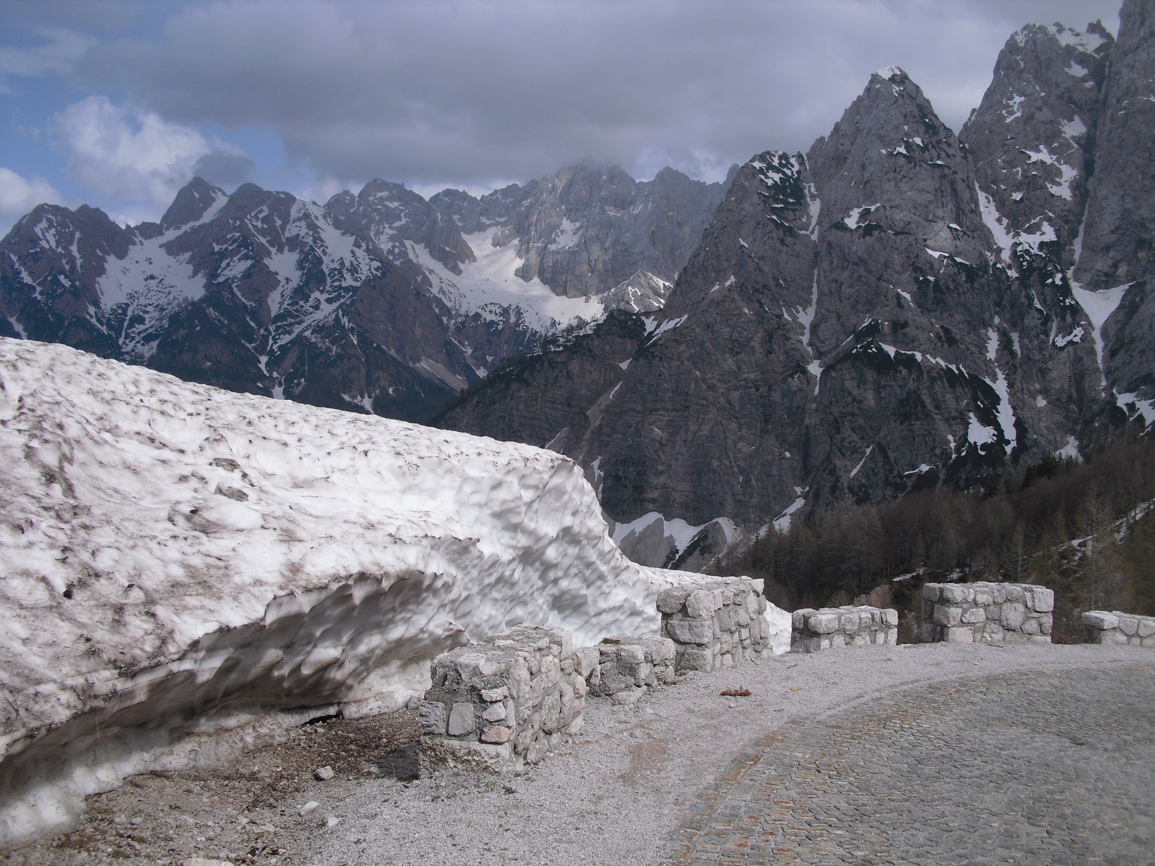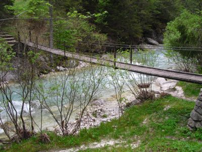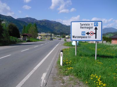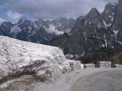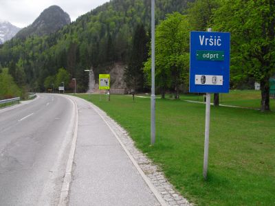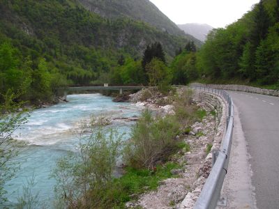 Early at six it rains a bit, but then comes the sun. After a good breakfast at the campground I pass the ski jump ramp at Villach and then the spa. The road to the Wurzen-pass is made like an autobahn. Biking is permitted, but anyhow I feel uncomfortable. Then comes the left turn to the Wurzen-pass. 18% slope grade is difficult to handle, especially with more traffic than expected. The many motorcycles are bothering me increasingly, in particular the loudly banging choppers. It seems that there are twice as many motorcycles than cars on the road. Perhaps this is because today is Saturday. The altitude difference to Villach is only 600 m, but it claims a lot of power. When I arrive at the top I have almost decided to finish today at Kranjka Gora, which lies just behind the Wurzen-pass and is famous with touristics, in winter as much as in summer. I remember that we have been here a long time ago with the children (of course not by bicycle). Here I have a break in the sun. After a while I feel strong enough to do the Vrsic-pass. It goes from 800 m to 1611 m altitude in a distance of 9 km. The numerous sharp bends are counted and labelled with the altitude, unfortunately the last 15 are missing. After half the distance a small restaurant invites for a break, I get a warm fresh blueberry cake. It is comfortable there, I nearly fall asleep on the chair. Nevertheless I have to get going again. It begins to rain now, and I have to cover the baggage again. To my right above me it begins to thunder, and I fear a heavy thundershower, but the rain remains moderate. I can continue. This is also necessary because it becomes colder and colder. Finally I arrive at the summit. It is uncomfortable like at the other passes, no hut or restaurant. Behind me the thunder is getting louder. Again I put on both jackets, gloves and headband and start the descent. The brakes are good and important because the baggage is heavy. I can't go very fast because the surface of the road is very uneven. It is painful for my soul to brake down the sweatfully conquered altitude, but there is no alternative. Down in Trenta it is distinctly warmer, I can put off jackets, gloves and headband. The descent continues through narrow valleys, almost ravines, always along the Soca river. This river's water is remarkably blue. The Landscape is untouched, not yet affected by tourism. I enjoy it very much, especially because it is mainly downhill. At 6 pm I arrive at Bovec, I don't want to go any further. The map doesn't show a campground on the next 80 km, and moreover I believe that two high mountain passes above 1000 m will be sufficient for one day even if the distance was not very far. After a hot shower at the campground I visit the restaurant and order a pizza. The waiter asks wether I want a regular or a big pizza. Of course I order a big one. When it comes I'm amazed: it is really huge, but I eat it with great appetite. After this there is still enough room for two pancakes with a nut stuffing. Now I'm really full (and tired). Tomorrow I would like to arrive in Croatia. |