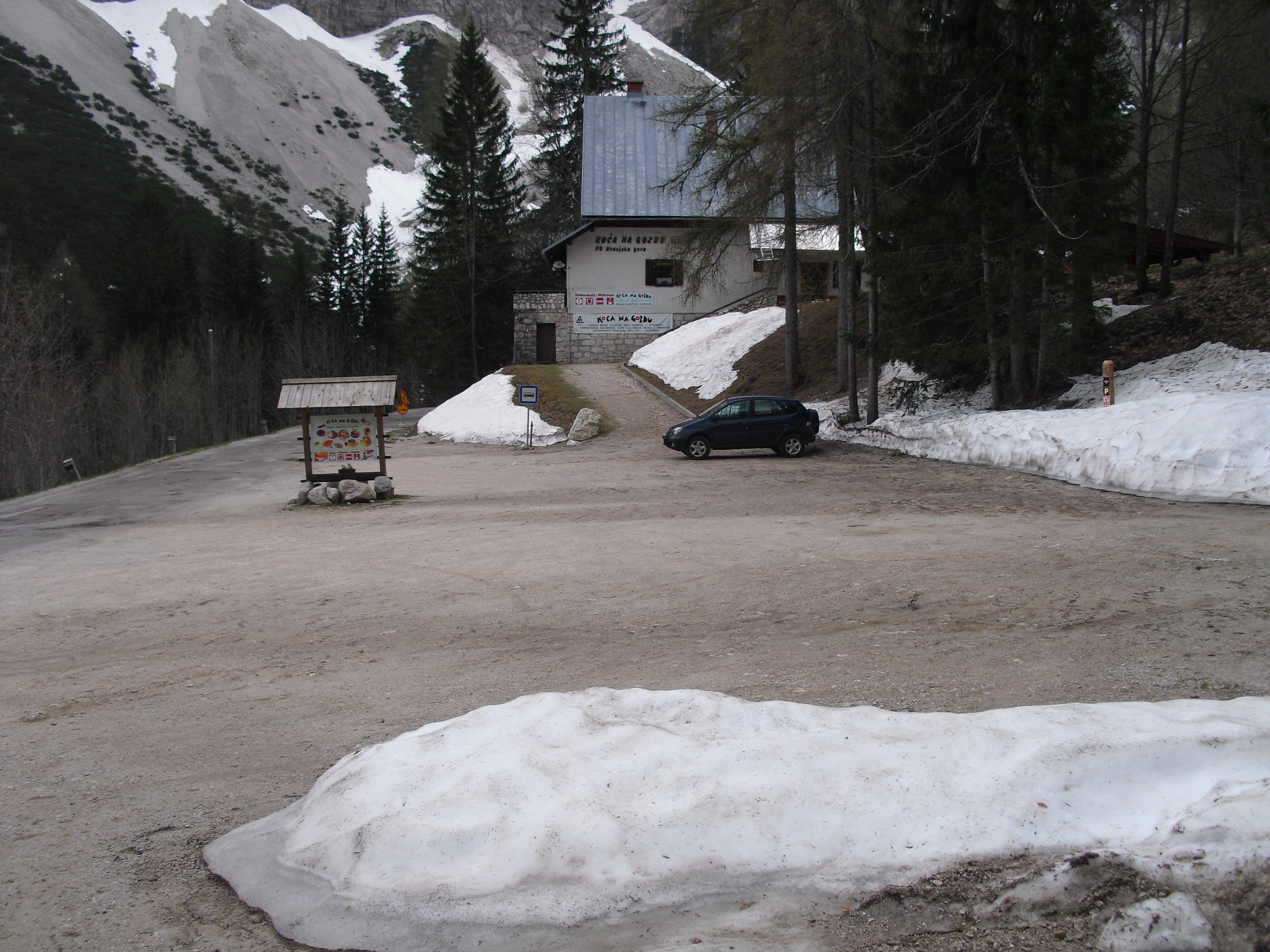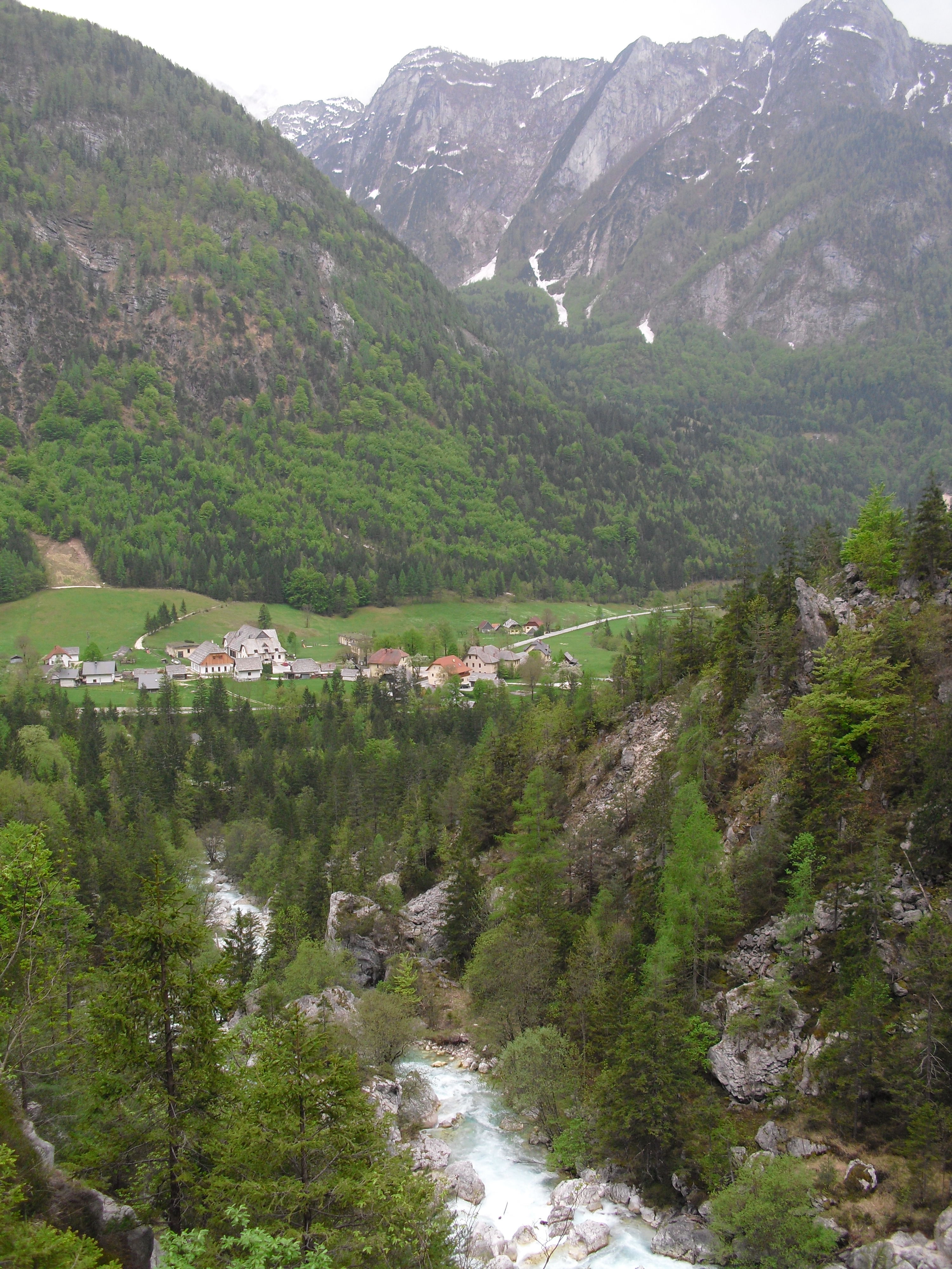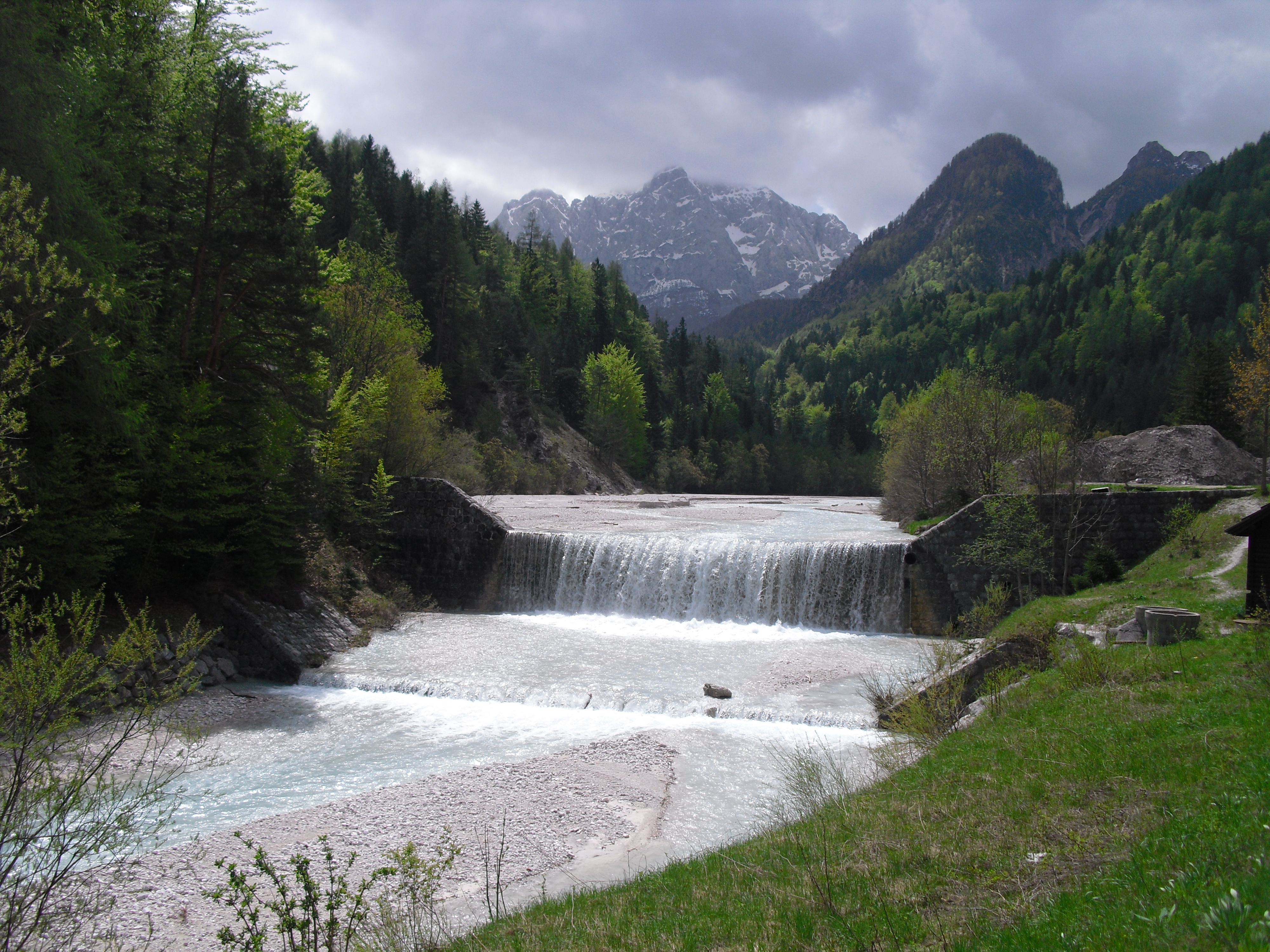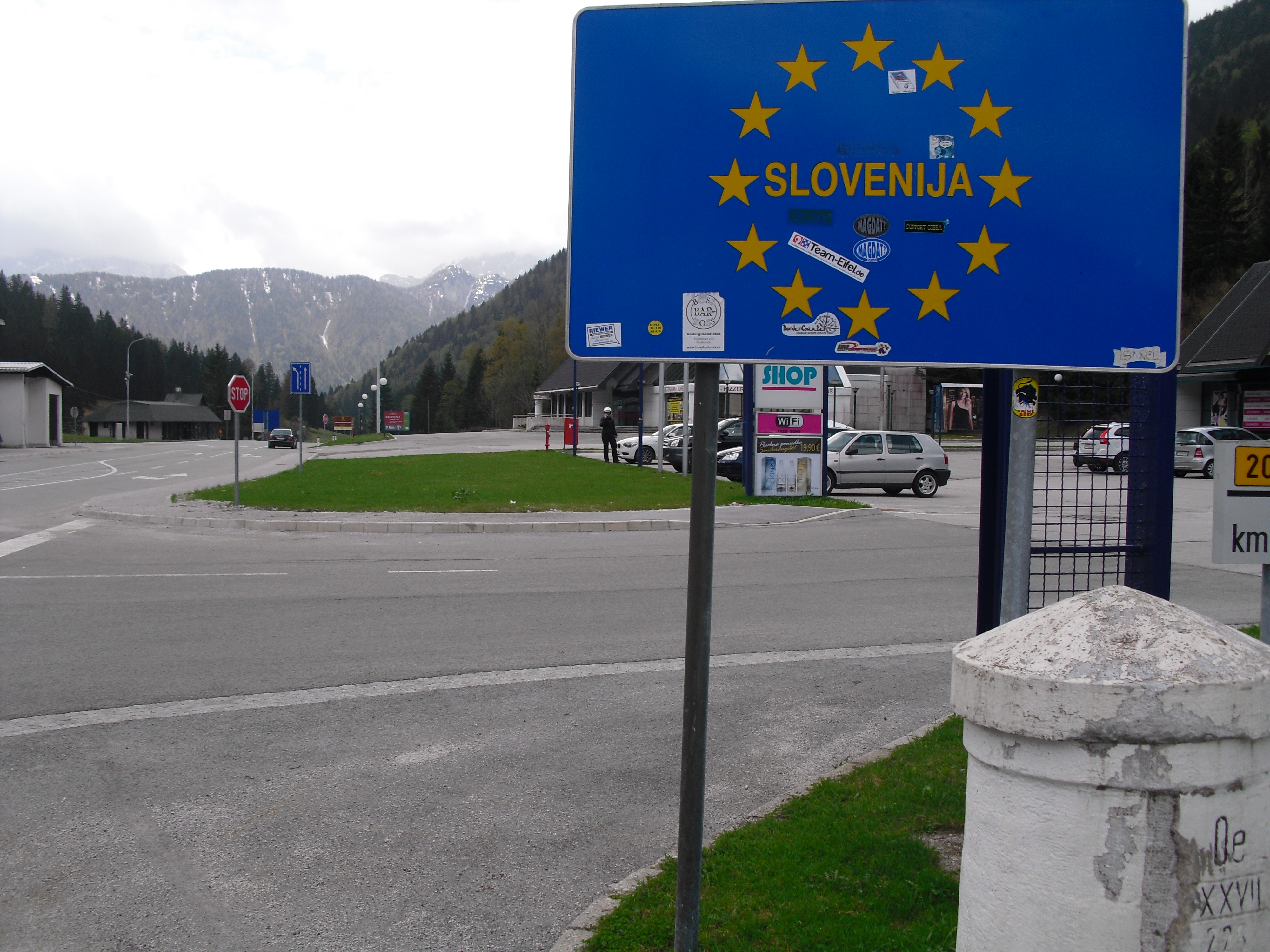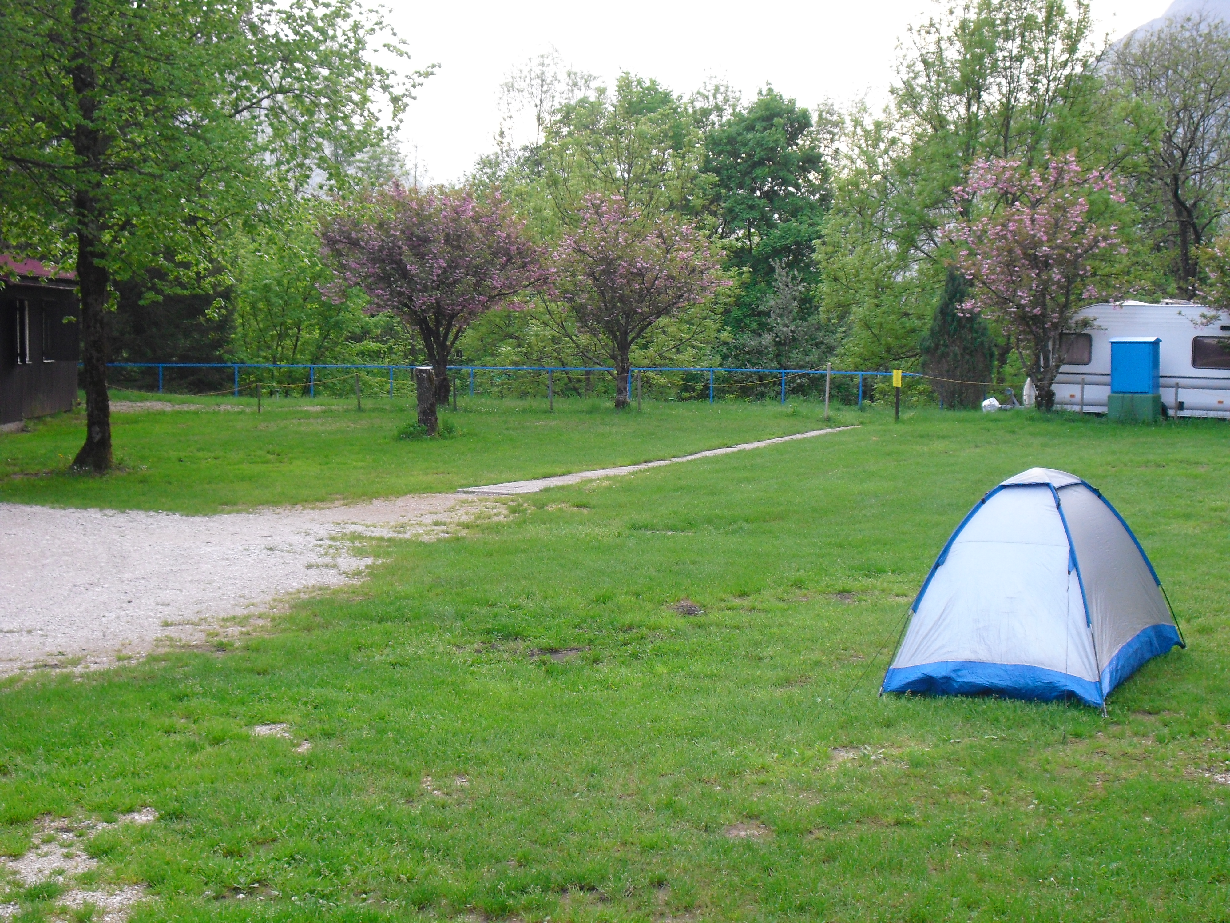 Early at six it rains a bit, but then comes the sun. After a good breakfast at the campground I pass the ski jump ramp at Villach and then the spa. The road to the Wurzen-pass is made like an autobahn. Biking is permitted, but anyhow I feel uncomfortable. Then comes the left turn to the Wurzen-pass. 18% slope grade is difficult to handle, especially with more traffic than expected. The many motorcycles are bothering me increasingly, in particular the loudly banging choppers. It seems that there are twice as many motorcycles than cars on the road. Perhaps this is because today is Saturday. The altitude difference to Villach is only 600 m, but it claims a lot of power. When I arrive at the top I have almost decided to finish today at Kranjka Gora, which lies just behind the Wurzen-pass and is famous with touristics, in winter as much as in summer. I remember that we have been here a long time ago with the children (of course not by bicycle). Here I have a break in the sun. After a while I feel strong enough to do the Vrsic-pass. It goes from 800 m to 1611 m altitude in a distance of 9 km. The numerous sharp bends are counted and labelled with the altitude, unfortunately the last 15 are missing. After half the distance a small restaurant invites for a break, I get a warm fresh blueberry cake. It is comfortable there, I nearly fall asleep on the chair. Nevertheless I have to get going again. It begins to rain now, and I have to cover the baggage again. To my right above me it begins to thunder, and I fear a heavy thundershower, but the rain remains moderate. I can continue. This is also necessary because it becomes colder and colder. Finally I arrive at the summit. It is uncomfortable like at the other passes, no hut or restaurant. Behind me the thunder is getting louder. Again I put on both jackets, gloves and headband and start the descent. The brakes are good and important because the baggage is heavy. I can't go very fast because the surface of the road is very uneven. It is painful for my soul to brake down the sweatfully conquered altitude, but there is no alternative. Down in Trenta it is distinctly warmer, I can put off jackets, gloves and headband. The descent continues through narrow valleys, almost ravines, always along the Soca river. This river's water is remarkably blue. The Landscape is untouched, not yet affected by tourism. I enjoy it very much, especially because it is mainly downhill. At 6 pm I arrive at Bovec, I don't want to go any further. The map doesn't show a campground on the next 80 km, and moreover I believe that two high mountain passes above 1000 m will be sufficient for one day even if the distance was not very far. After a hot shower at the campground I visit the restaurant and order a pizza. The waiter asks wether I want a regular or a big pizza. Of course I order a big one. When it comes I'm amazed: it is really huge, but I eat it with great appetite. After this there is still enough room for two pancakes with a nut stuffing. Now I'm really full (and tired). Tomorrow I would like to arrive in Croatia. |