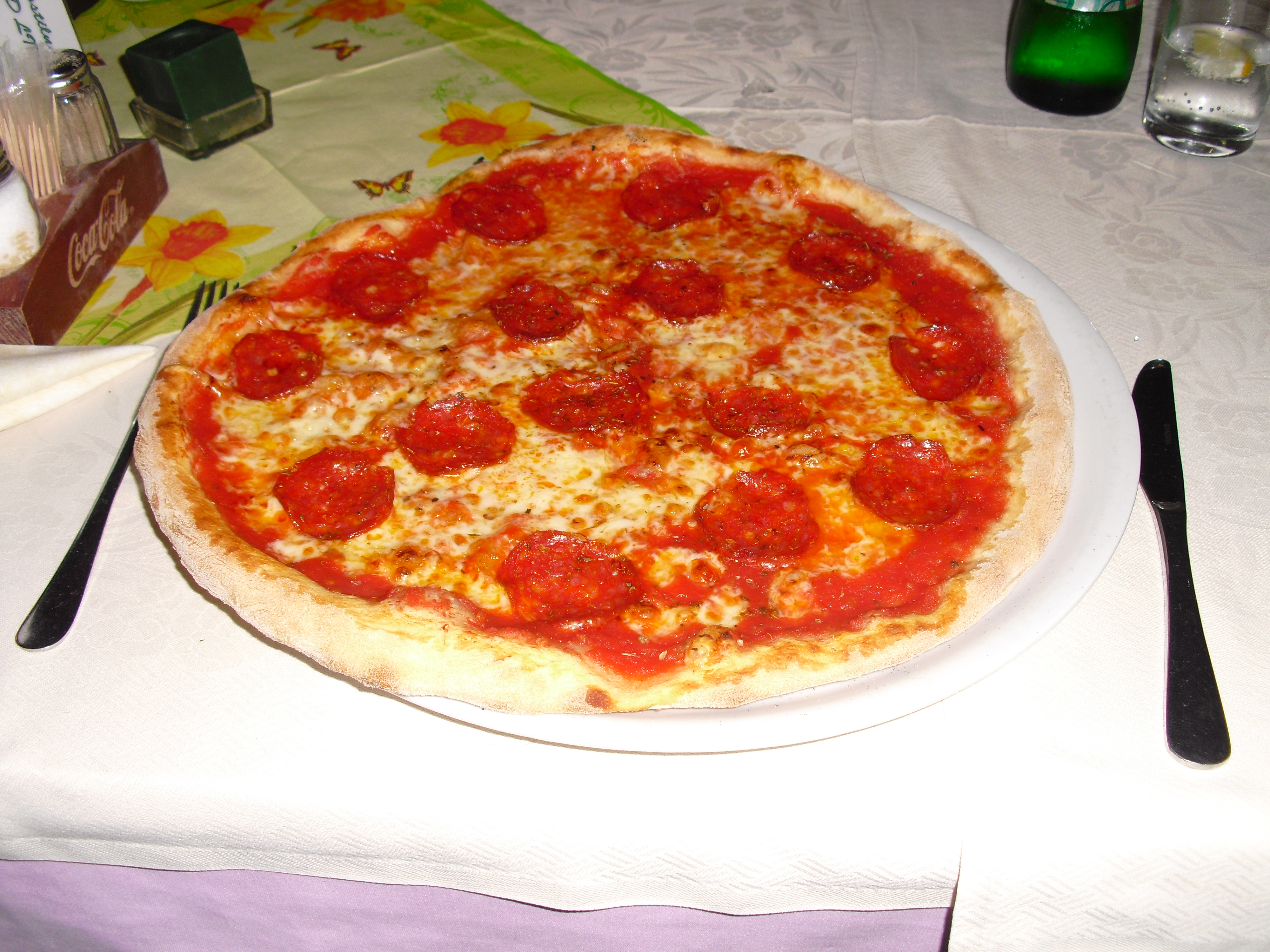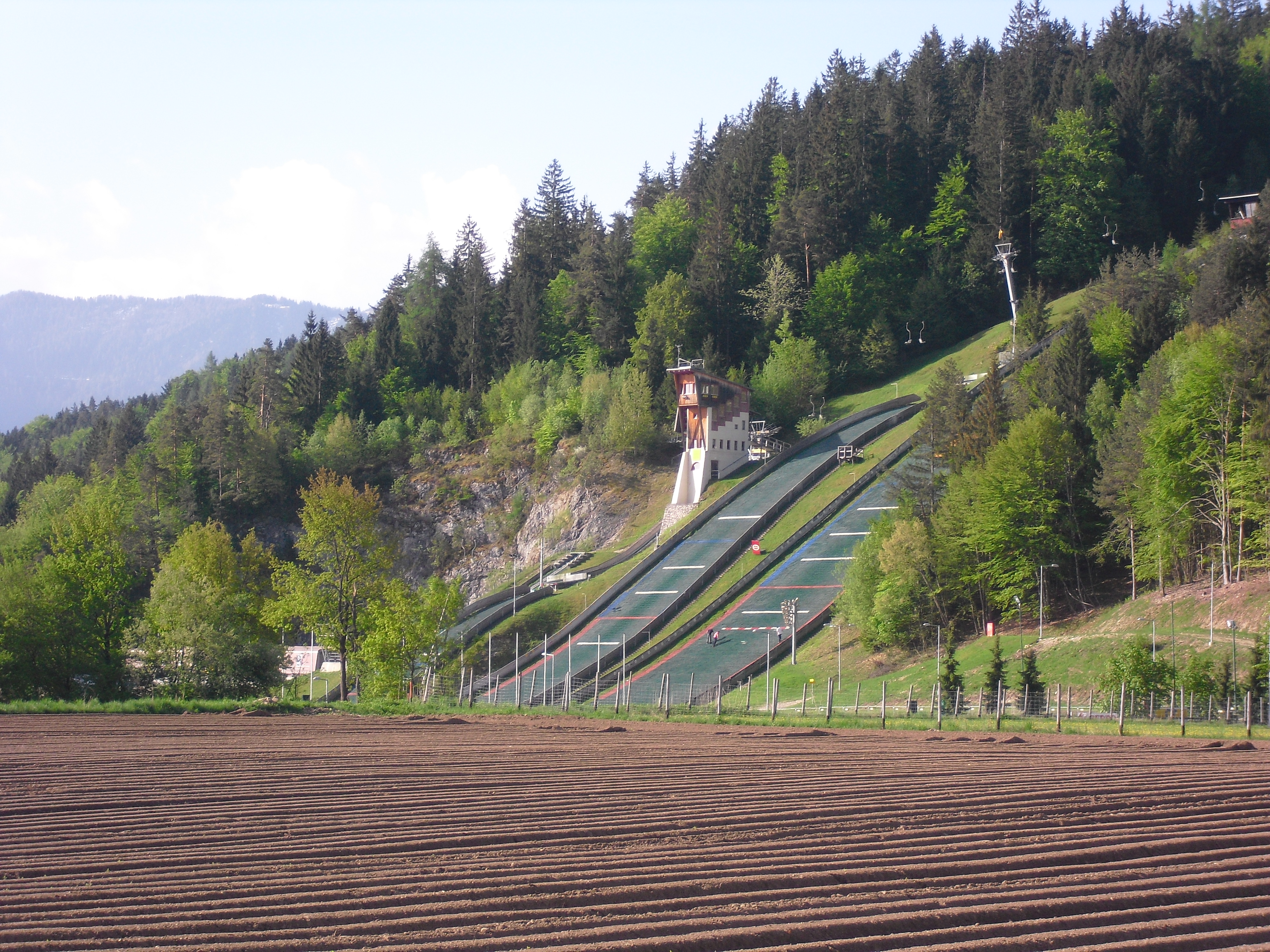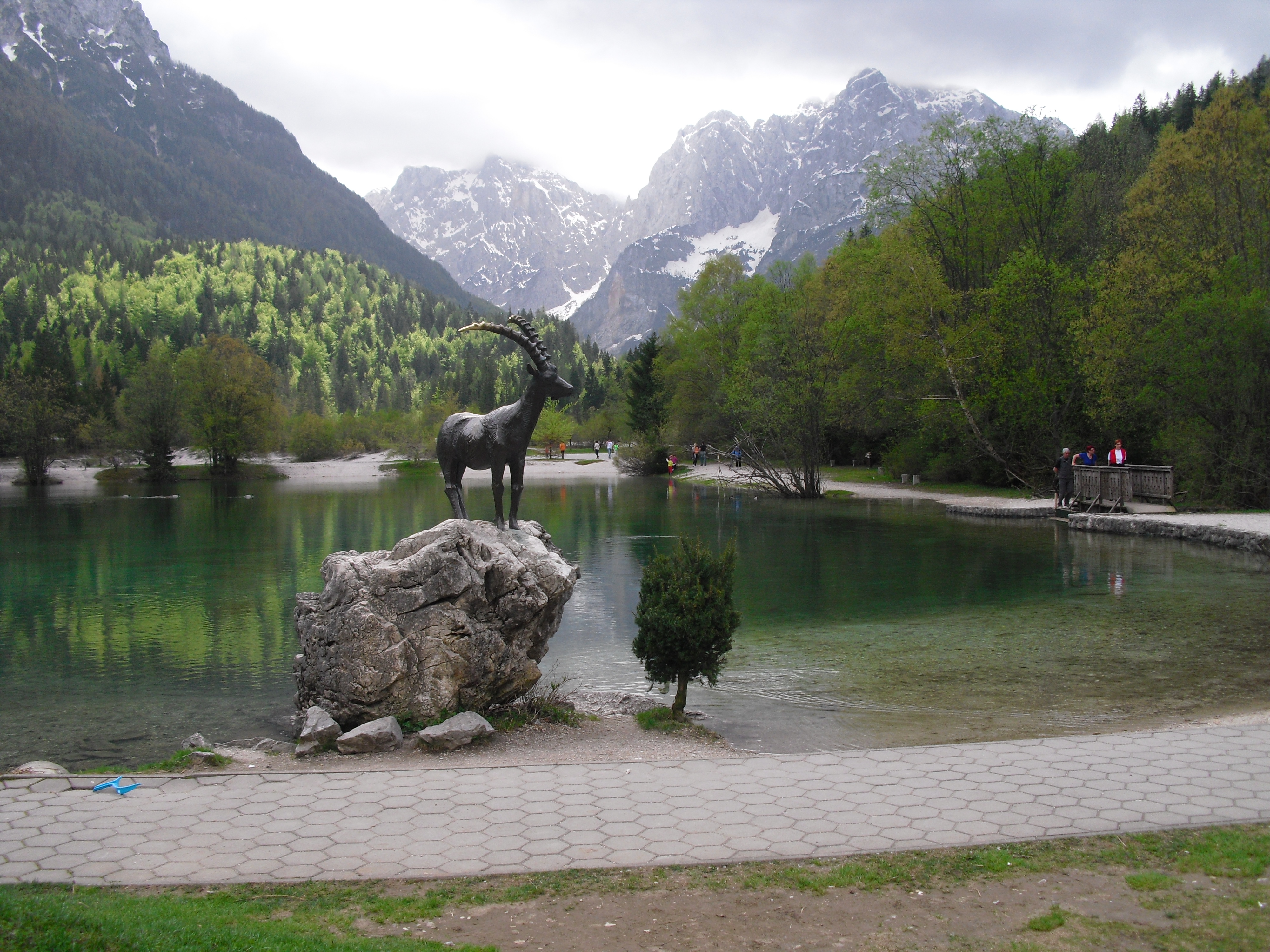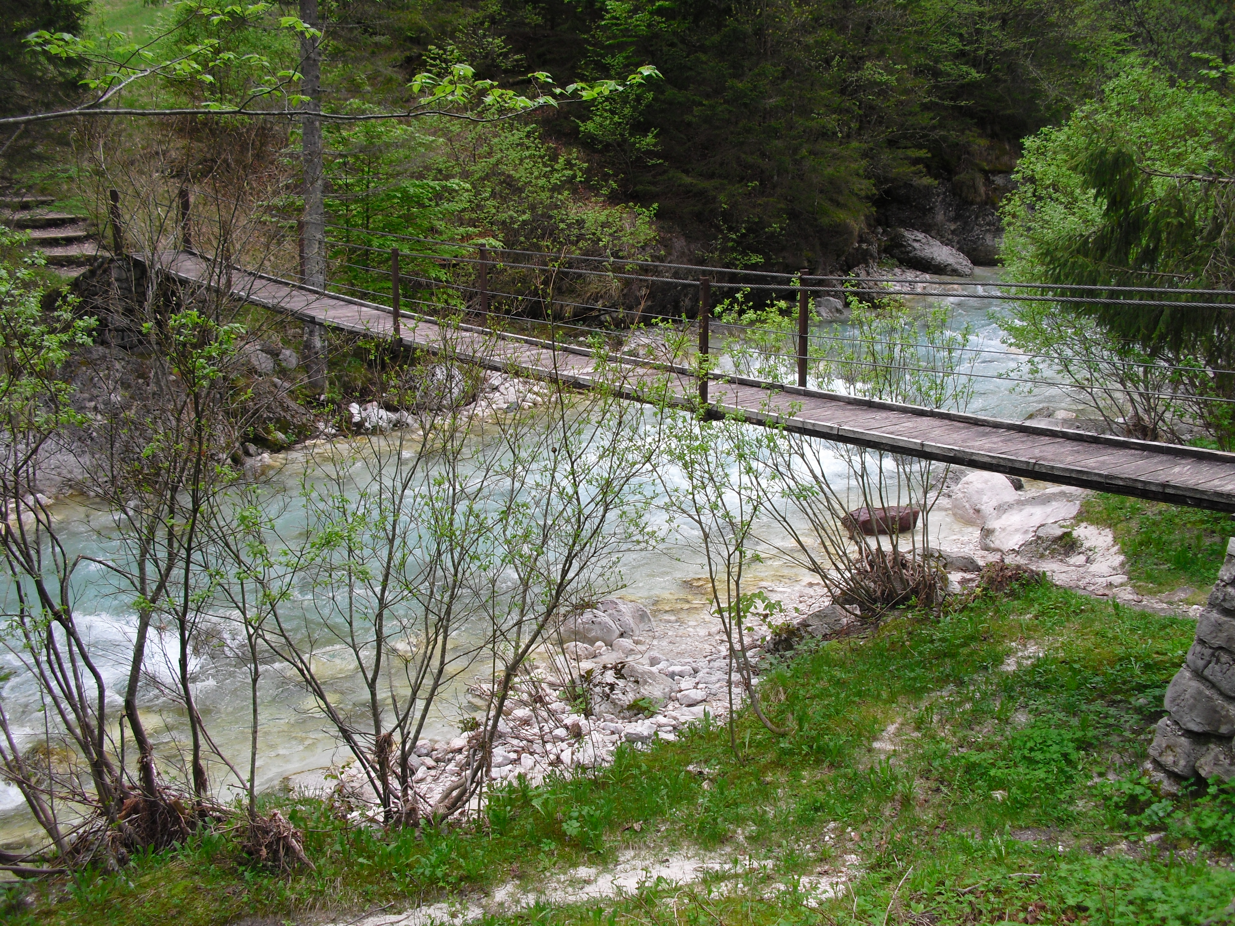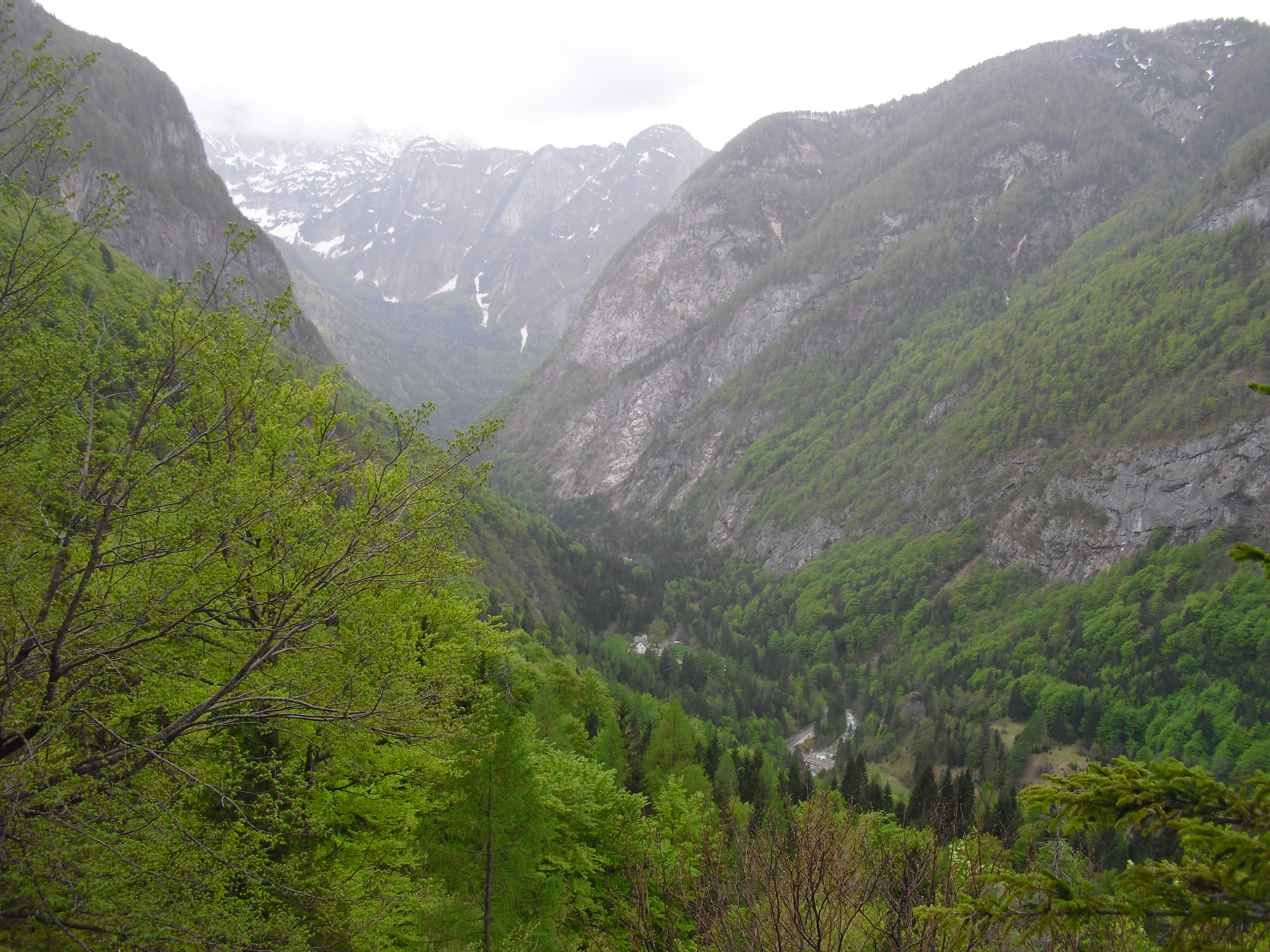 Early at six it rains a bit, but then comes the sun. After a good breakfast at the campground I pass the ski jump ramp at Villach and then the spa. The road to the Wurzen-pass is made like an autobahn. Biking is permitted, but anyhow I feel uncomfortable. Then comes the left turn to the Wurzen-pass. 18% slope grade is difficult to handle, especially with more traffic than expected. The many motorcycles are bothering me increasingly, in particular the loudly banging choppers. It seems that there are twice as many motorcycles than cars on the road. Perhaps this is because today is Saturday. The altitude difference to Villach is only 600 m, but it claims a lot of power. When I arrive at the top I have almost decided to finish today at Kranjka Gora, which lies just behind the Wurzen-pass and is famous with touristics, in winter as much as in summer. I remember that we have been here a long time ago with the children (of course not by bicycle). Here I have a break in the sun. After a while I feel strong enough to do the Vrsic-pass. It goes from 800 m to 1611 m altitude in a distance of 9 km. The numerous sharp bends are counted and labelled with the altitude, unfortunately the last 15 are missing. After half the distance a small restaurant invites for a break, I get a warm fresh blueberry cake. It is comfortable there, I nearly fall asleep on the chair. Nevertheless I have to get going again. It begins to rain now, and I have to cover the baggage again. To my right above me it begins to thunder, and I fear a heavy thundershower, but the rain remains moderate. I can continue. This is also necessary because it becomes colder and colder. Finally I arrive at the summit. It is uncomfortable like at the other passes, no hut or restaurant. Behind me the thunder is getting louder. Again I put on both jackets, gloves and headband and start the descent. The brakes are good and important because the baggage is heavy. I can't go very fast because the surface of the road is very uneven. It is painful for my soul to brake down the sweatfully conquered altitude, but there is no alternative. Down in Trenta it is distinctly warmer, I can put off jackets, gloves and headband. The descent continues through narrow valleys, almost ravines, always along the Soca river. This river's water is remarkably blue. The Landscape is untouched, not yet affected by tourism. I enjoy it very much, especially because it is mainly downhill. At 6 pm I arrive at Bovec, I don't want to go any further. The map doesn't show a campground on the next 80 km, and moreover I believe that two high mountain passes above 1000 m will be sufficient for one day even if the distance was not very far. After a hot shower at the campground I visit the restaurant and order a pizza. The waiter asks wether I want a regular or a big pizza. Of course I order a big one. When it comes I'm amazed: it is really huge, but I eat it with great appetite. After this there is still enough room for two pancakes with a nut stuffing. Now I'm really full (and tired). Tomorrow I would like to arrive in Croatia. |